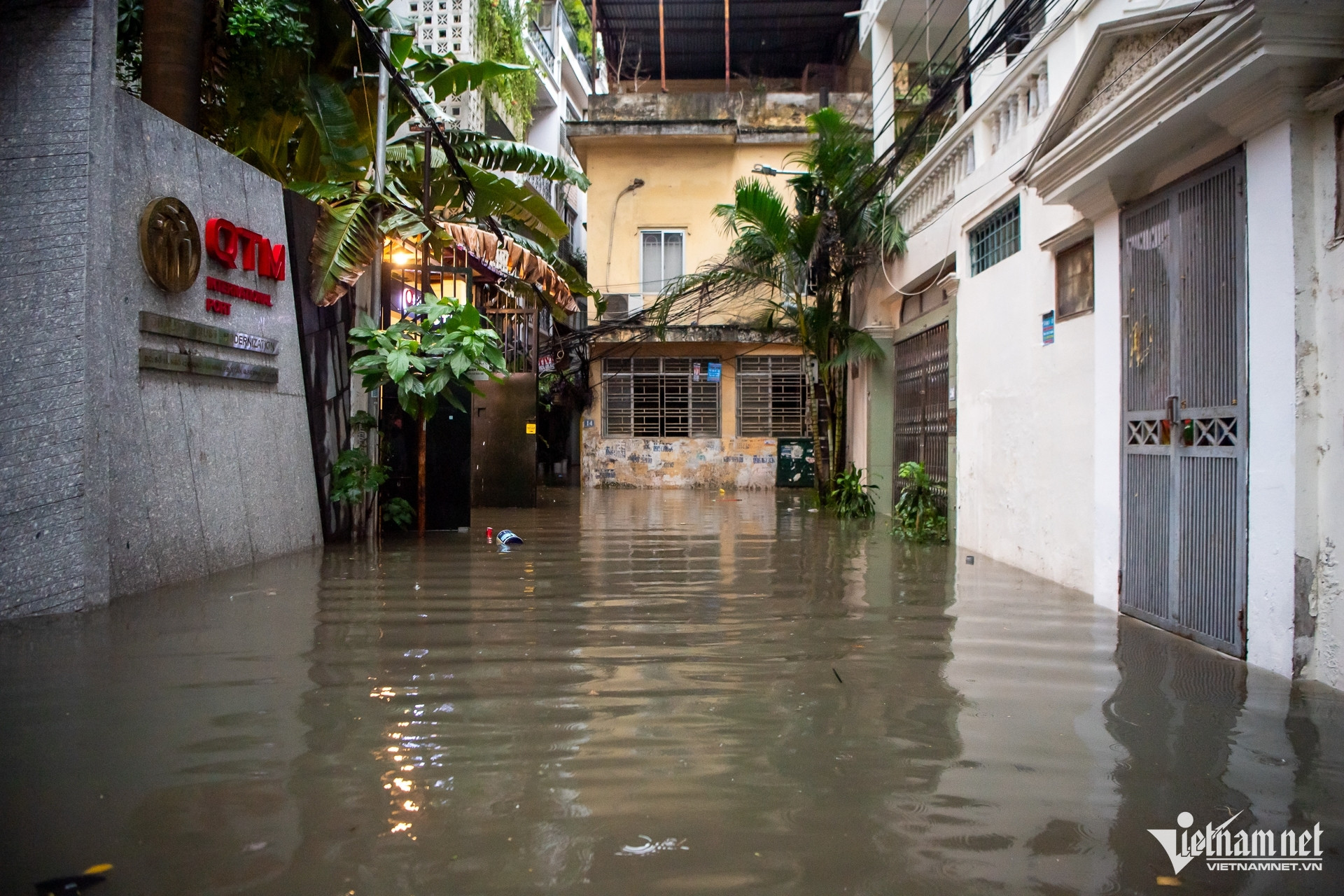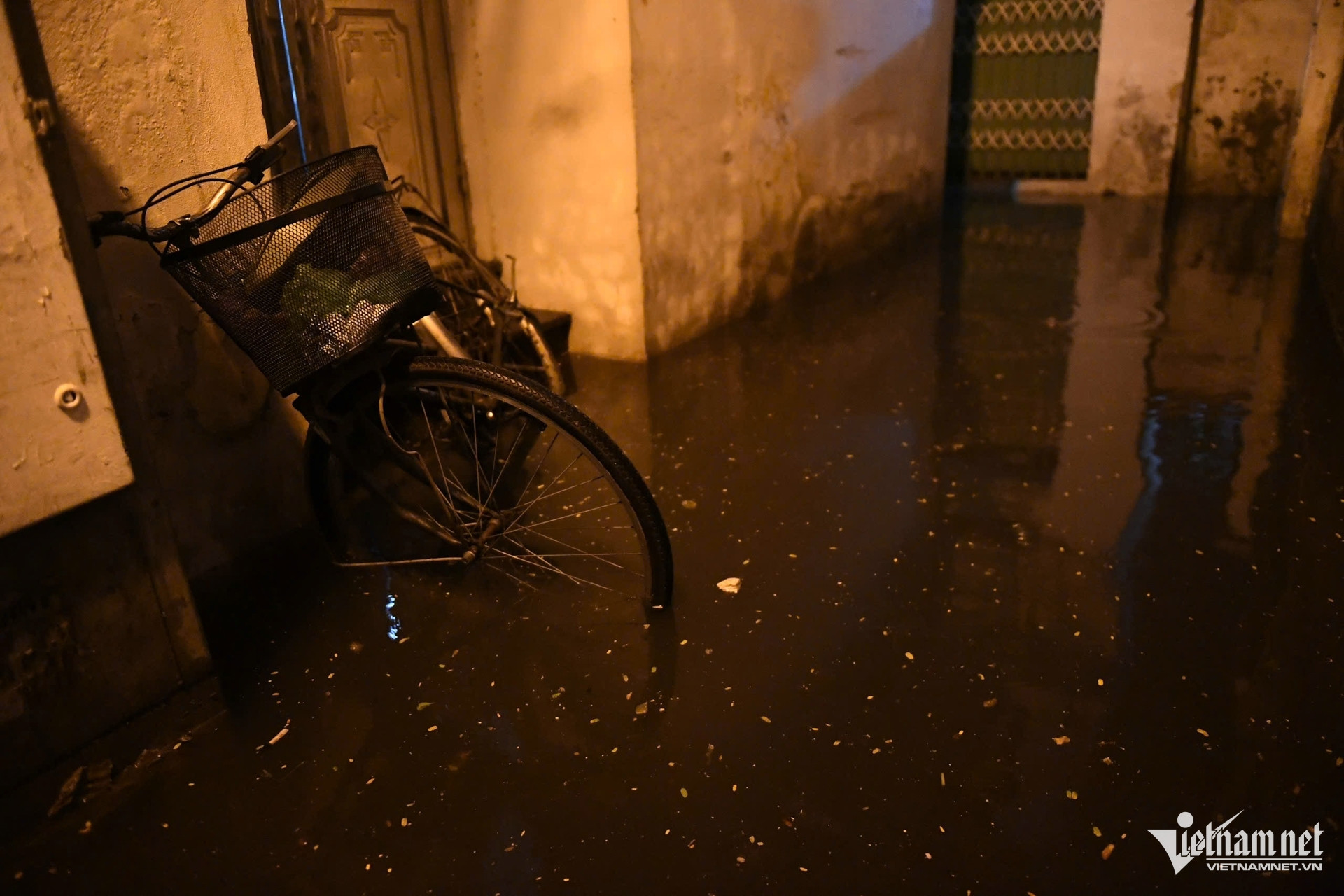 Bên ngoài ngõ, nước cống dâng lên hoà vào nước mưa hiện lên đen kịt.