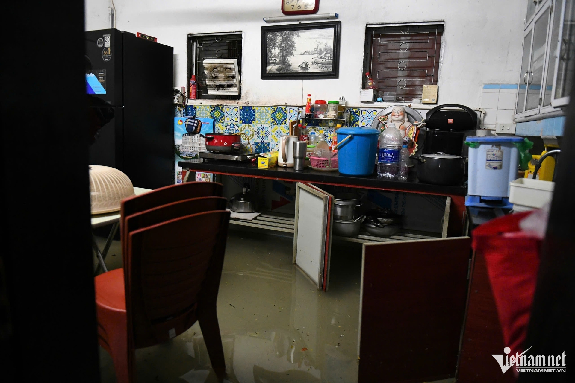 Miếng chắn ngập cao gần 1m được gia đình ông chặn ngang cửa, dùng khi mưa lớn. Trong buổi tối nay, ngay cửa nhà nước đã lên mấp mé miếng chắn. Bên trong gian bếp gia đình ông Mậu, nước ngập chân bàn, tủ.