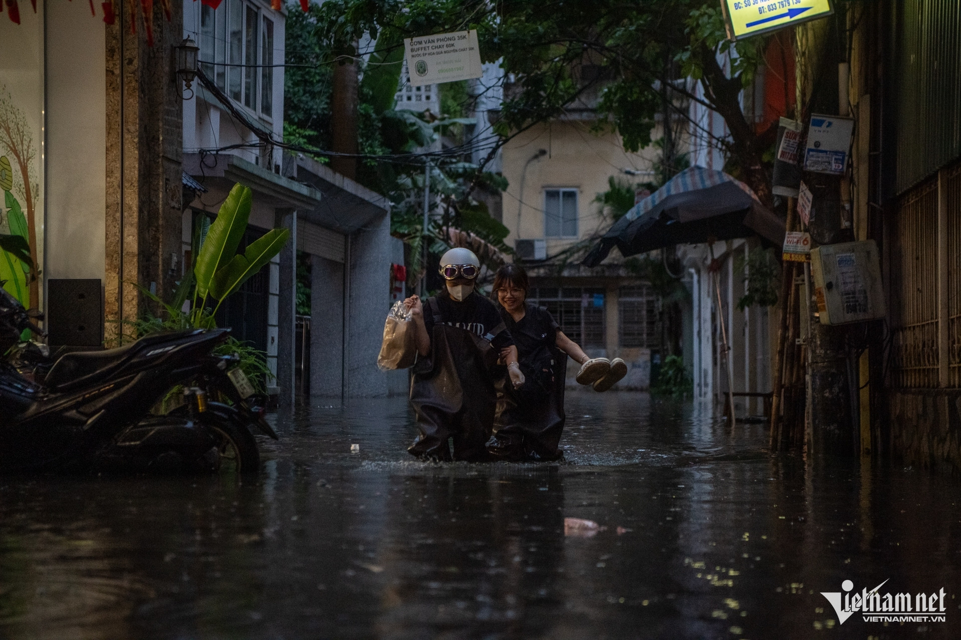 16h30 ngày 30/6, Hà Nội xuất hiện một trận mưa lớn. Bầu trời nhanh chóng tối sầm, nhiều khu dân cư rơi vào cảnh ngập nặng. Tại ngõ 42 Giang Văn Minh, cảnh người dân trở về nhà phải cõng nhau diễn ra phổ biến.