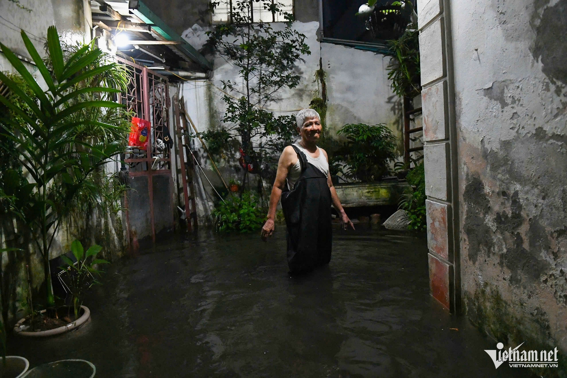 Khoảng sân của gia đình ông Mậu trong ngõ 90 Đội Cấn ngập sâu 70cm chỉ sau trận mưa rào. Ông Mậu cho biết, sống ở đây từ ngày lên 5 tuổi, đến nay vẫn ngày một ngập nặng hễ mưa lớn kéo dài. "Chừng 15 phút là ngập tới đầu gối luôn rồi”, ông than thở.