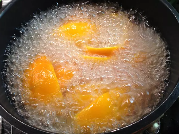 Bạn rửa kỹ phần vỏ cam với nước rồi cho vào nồi, đổ xâm xấp nước và luộc cho đến khi nước sôi thì vớt vỏ cam ra. Thay nước và tiếp tục luộc thêm 1 lần nữa. Lúc này, bạn hãy nếm thử, nếu cảm thấy vỏ cam còn vị đắng ngắt, hãy thay nước và luộc thêm 1-2 lần nữa, đến khi nào nếm thử mà cảm thấy vỏ cam không còn đắng nữa là được.