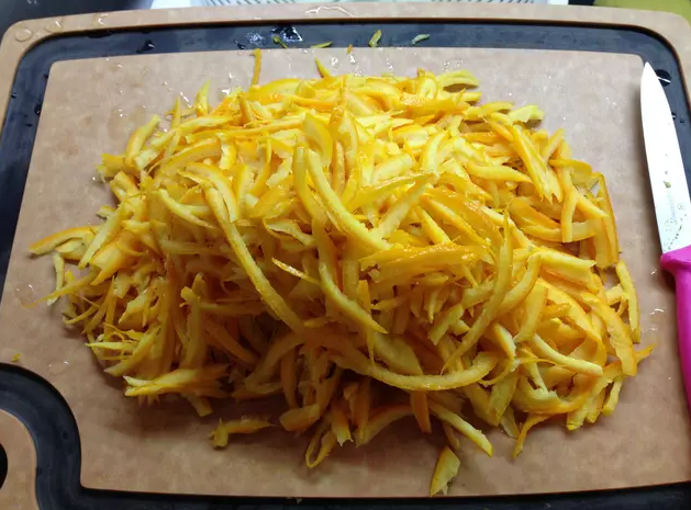 Luộc xong, bạn đợi cho vỏ cam nguội bớt rồi thái thành miếng dạng sợi dài hoặc thái hạt lựu đều được.