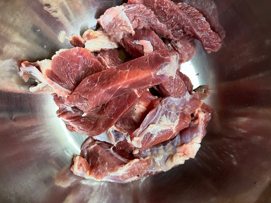 Thịt bò sơ chế sạch sau đó thái thành dải dày.