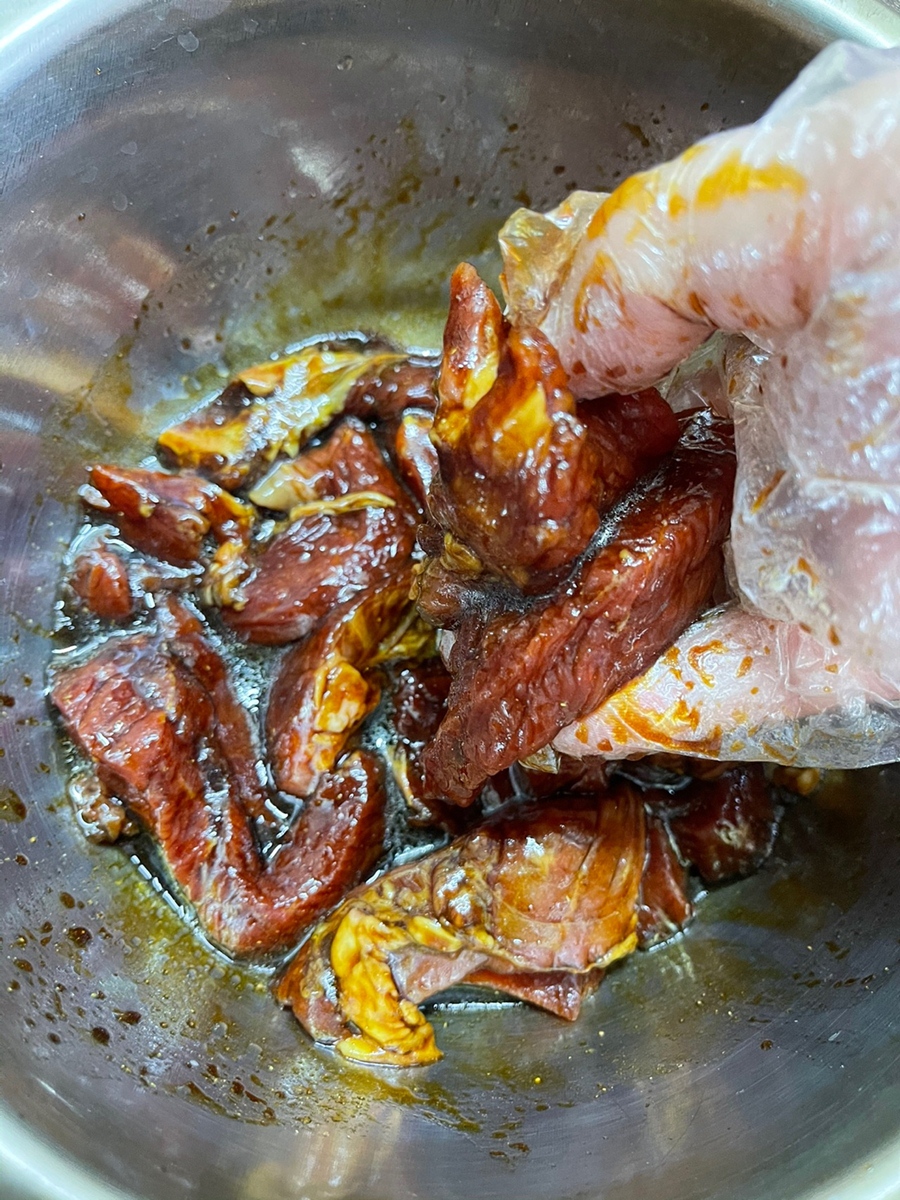 Cho thịt bò vào thố, thêm chút dầu ăn, nước tương, dầu hào, rượu nấu ăn, chút ớt bột vào trộn đều. Ướp thịt khoảng 30 phút cho ngấm gia vị.