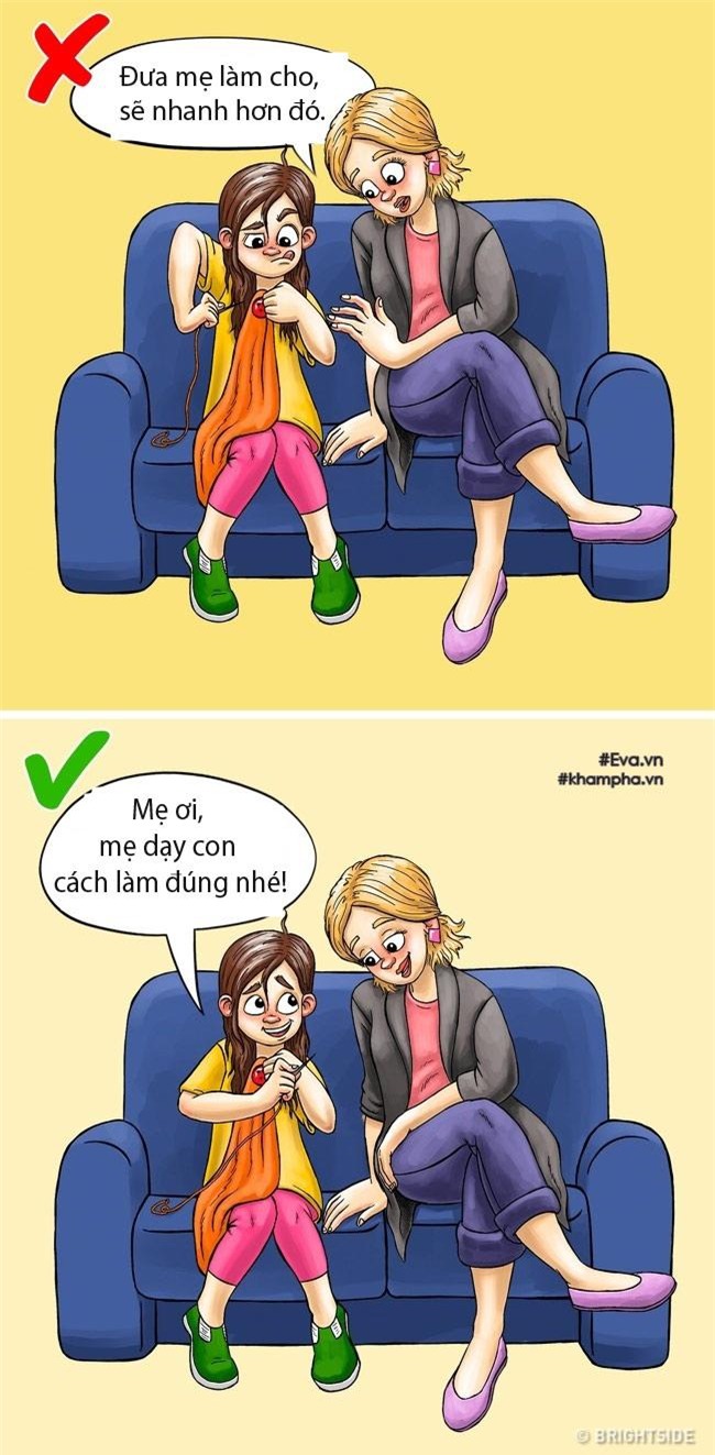 Bố mẹ thường không kiên nhẫn khi con cái tự làm những việc trong khả năng mà mắc lỗi. Thông thường các bậc phụ huynh muốn làm hộ bé mọi việc để tiết kiệm thời gian. Tuy nhiên, bố mẹ nên để bé tự làm và không giúp đỡ khi không cần thiết. Khi tự làm mọi việc, bé sẽ tự tin hơn. Làm thay bé sẽ khiến bé không thể trưởng thành được.