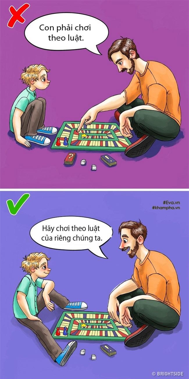 Khi bố mẹ chơi với con cái thường có xu hướng bắt bé tuân theo các luật trong trò chơi một cách cứng nhắc. Bố mẹ nghĩ rằng tập chung cho bé tuân theo luật lệ là cách giáo dục tốt bởi vì cuộc sống của người trường thành có rất nhiều nguyên tắc. Tuy nhiên điều đó sẽ hạn chế sự sáng tạo và trí tưởng tượng của bé. Khi bé biết suy nghĩ sáng tạo thì bé sẽ dễ thành công hơn sau này. Vì vậy bố mẹ hãy để bé chơi theo luật riêng của bé. Trò chơi sẽ trở nên thú vị và hấp dẫn hơn bình thường.
