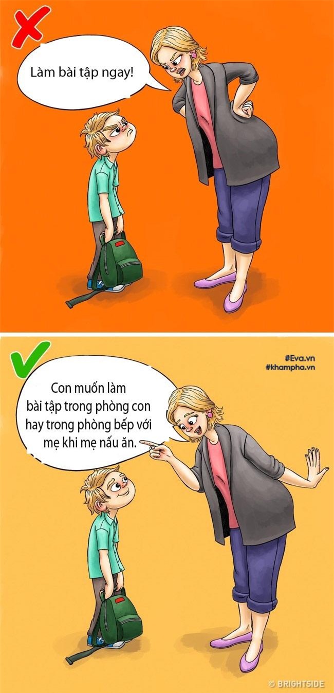 Làm bài tập về nhà hay dọn dẹp nhà cửa là cần thiết. Tuy nhiên mẹ không nên nói với bé bằng giọng cáu gắt, ép buộc. Thay vào đó hãy cho bé sự lựa chọn phù hợp. Điều này sẽ giúp bé học được cách ra quyết định mà bố mẹ vẫn giám sát được bé.