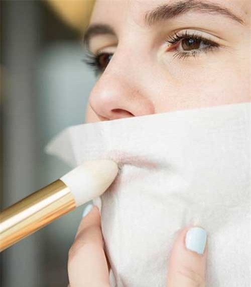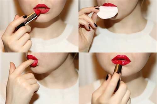 Sau khi thoa son, hãy lấy một mẩu giấy ăn đặt lên môi rồi dặm bằng phấn phủ ở bên ngoài rồi thoa thêm một lớp son nữa. Cách này sẽ giúp bạn ăn uống thoải mái cả ngày mà không sợ son bị trôi.