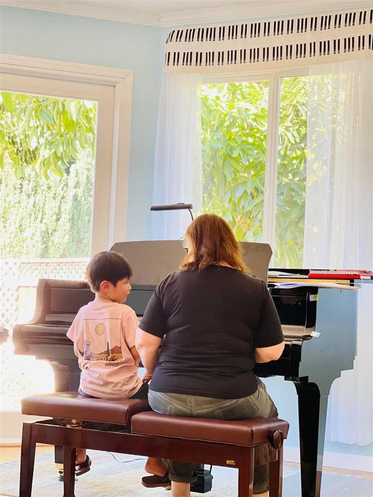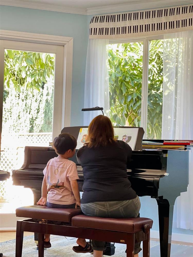 Thiên Từ trong buổi học đàn piano đầu tiên với cô giáo.