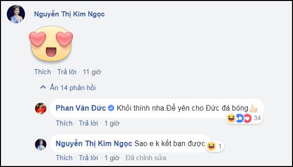 Cách đây ít giờ, tài khoản Facebook được cho là của Hoa hậu Biển Việt Nam Toàn cầu 2018 - Nguyễn Thị Kim Ngọc gây chú ý khi bình luận "thả tim" vào một bài viết của cầu thủ Phan Văn Đức. Sự việc này đã gây ra rất nhiều sự chú ý cho cộng đồng mạng.