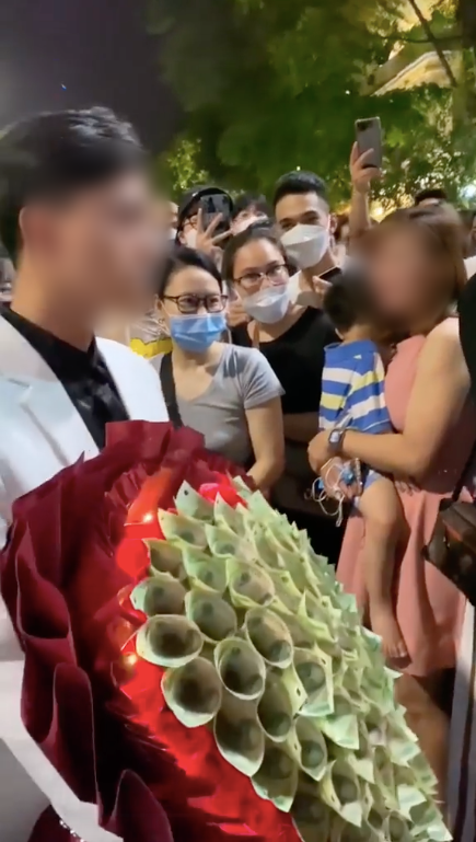 Anh chàng ôm một bó hoa tiền, mặc vest trắng bảnh bao và tiến đến tỏ tình với một cô nàng xinh đẹp.