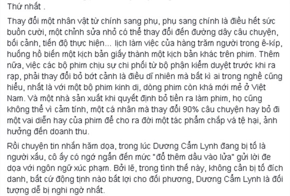 Theo đó, Dương Cẩm Lynh khẳng định xưa nay cô chưa bao giờ dùng tình cảm để đổi lấy vai diễn. Và lời tố cáo đổi từ vai chính sang vai phụ trong phim "Mặt nạ máu", hay câu chuyện nhắn tin hăm dọa Tinna Tình... là hoàn toàn sai sự thật.