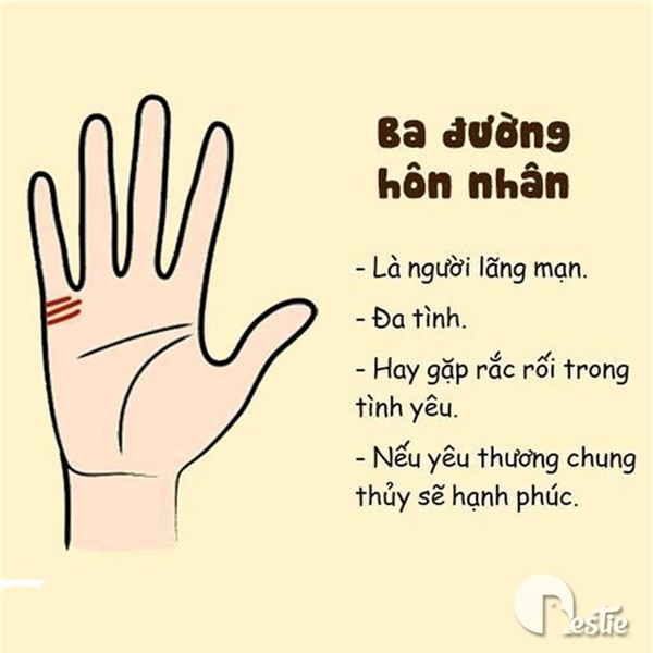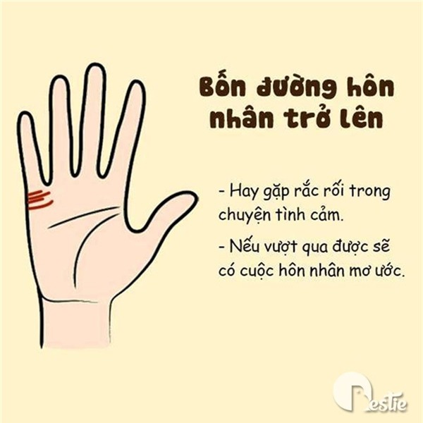 Với 3 đường hôn nhân trên một bàn tay là đã quá nhiều. Cho những ai có đến 4 hoặc trên 4 đường thông thường là những người hay gặp trắc trở trong chuyện tình cảm. Yêu đương thị phi, vướng vào những nỗi khổ không đáng có....
