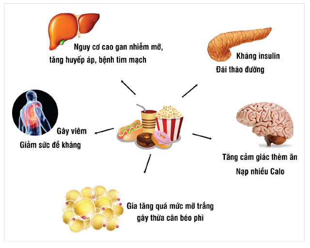 - Đường dư thừa sẽ chuyển thành mỡ trắng: Cơ thể có cơ chế tự cân đối để đảm bảo nồng độ đường trong máu duy trì ở 0,8-1,2g/lít. Do đó, khi dung nạp quá nhanh và nhiều, phần đường dư thừa được chuyển thành năng lượng dự trữ dưới dạng glycogen và triglyceride. Tuy nhiên, dự trữ glycogen trong cơ thể khá hạn chế, khoảng 200-250g nên phần còn lại nhanh chóng được chuyển thành mỡ trắng tích lũy dưới da và quanh nội tạng, gây nên tình trạng thừa cân béo phì, kéo theo nguy cơ mắc hàng loạt bệnh mãn tính như tim mạch, tiểu đường...