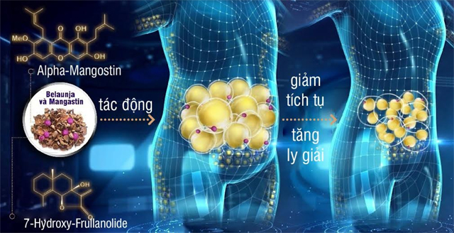Một mặt Belaunja & Mangastin hạn chế tế bào mỡ trắng gia tăng kích thước bằng cách giảm tác động của các thụ thể thúc đẩy chất béo đi vào tế bào mỡ trắng; mặt khác hai hoạt chất này mở sẵn cánh cổng để chất béo dễ dàng được rút ra khỏi tế bào mỡ trắng, từ đó giảm kích thước tế bào mỡ trắng.