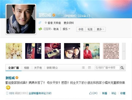 Dòng thông báo vợ đã sinh hạ thành công của Lưu Khải Uy.