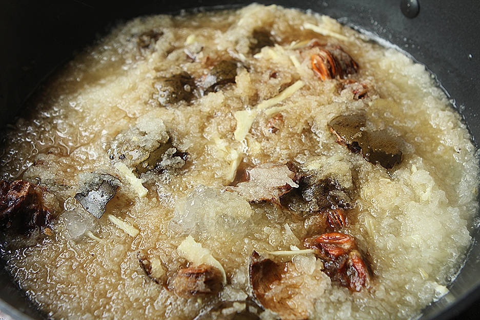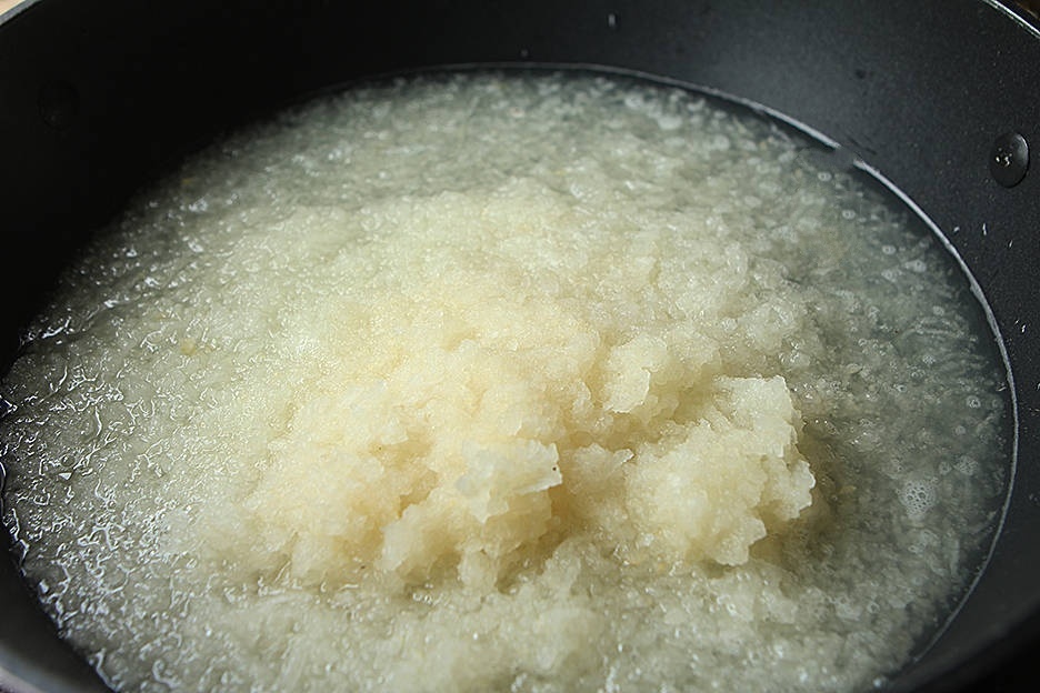 Cho lê đã xay vào nồi, thêm đường phèn, la hán, gừng thái sợi vào. Đun ở lửa lớn cho sôi (không cần thêm nước), sau đó vặn nhỏ lửa và tiếp tục đun trong khoảng 30 phút.