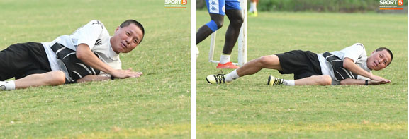 HLV Chu Đình Nghiêm cũng tham gia đá tập cùng học trò. Biểu cảm hài hước của vị chiến lược gia này khi bị học trò đốn ngã.