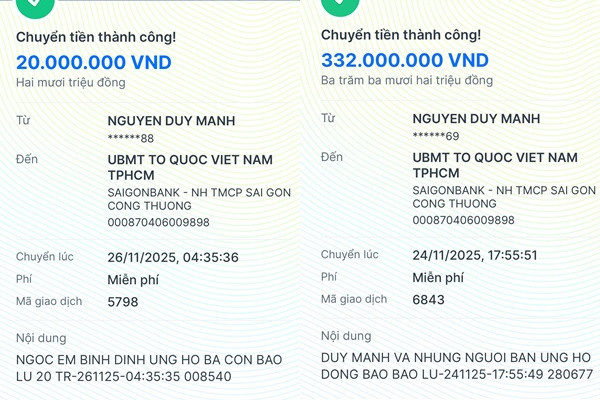 "Cách đây 2 ngày mình và anh em bạn bè đã cùng chung tay quyên góp số tiền 332 triệu ủng hộ đồng bào vùng bão lũ. Và mình đã chuyển đến Mặt trận Tổ quốc toàn bộ số tiền đó. Tối qua có 1 người bạn lại gửi 20 triệu nhờ mình chuyển đến Mặt trận Tổ quốc để ủng hộ đồng bào đang gặp thiên tai bão lũ. Nên mình chuyển thêm 20 triệu tiền của người bạn mình đến Mặt trận Tổ quốc. Vậy là tổng số tiền của mình và những người bạn là 352 triệu.