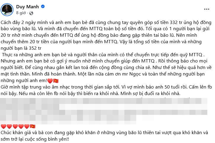 Nam ca sĩ cũng nêu rõ lý do vì sao nhận tiền quyên góp từ anh em thân thiết là do bạn bè của Duy Mạnh gợi ý muốn nhờ anh chuyển giúp đến Mặt trận Tổ quốc rồi thông báo cho mọi người biết để cùng nhau gắn kết lan toả đến cộng đồng cùng chia sẻ.