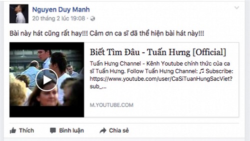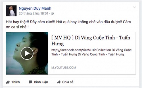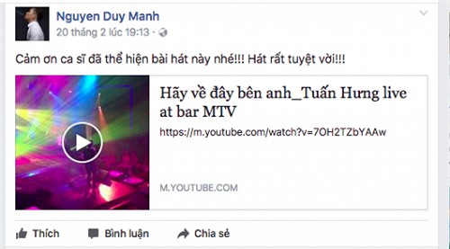 Mặc dù không nói cụ thể về ai nhưng nhiều người cho rằng Tuấn Hưng đang bóng gió về đồng nghiệp Duy Mạnh. Bởi ngay sau đó, trên trang cá nhân của mình, giọng ca Kiếp đỏ đen cũng liên tục chia sẻ đường link bài hát do mình sáng tác nhưng được Tuấn Hưng thể hiện như Hãy về đây bên em, Biết tìm đâu, Dĩ vãng cuộc tình… Chưa dừng lại đó, Duy Mạnh còn chú thích: “Cám ơn ca sĩ đã thể hiện bài hát này nhé! Hát rất tuyệt vời!” hoặc “Hát hay thật! Đầy cảm xúc! Hát quá hay không chê vào đâu được”…