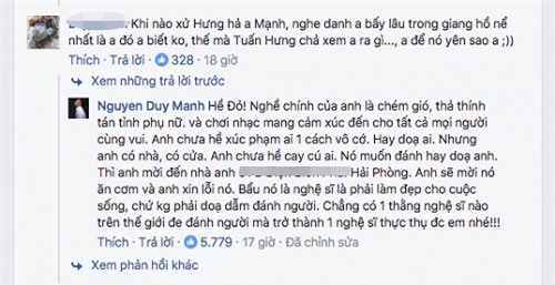 Mới đây, khi một tài khoản Facebook để lại bình luận dưới dòng trạng thái của Duy Mạnh với dấu hỏi lớn: “Khi nào xử Hưng hả anh Mạnh. Nghe danh anh bấy lâu trong giang hồ nể nhất là anh đó anh biết không. Thế mà Tuấn Hưng chả xem anh ra gì. Anh để nó yên sao anh“.