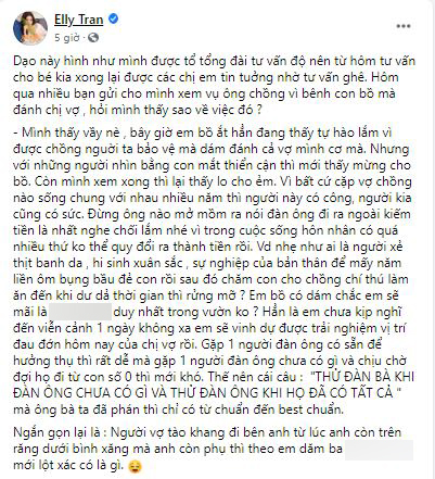 Ví dụ nhẹ như ai là người xẻ thịt banh da, hi sinh xuân sắc , sự nghiệp của bản thân để mấy năm liền ôm bụng bầu đẻ con rồi sau đó chăm con cho chồng chí thú làm ăn đến khi dư dả thời gian thì rửng mỡ? Em bồ có dám chắc em sẽ mãi là ... duy nhất trong vườn không? Hẳn là em chưa kịp nghĩ đến viễn cảnh 1 ngày không xa em sẽ vinh dự được trải nghiệm vị trí đau đớn hôm nay của chị vợ rồi. Gặp 1 người đàn ông có sẵn để hưởng thụ thì rất dễ mà gặp 1 người đàn ông chưa có gì và chịu chờ đợi họ đi từ con số 0 thì mới khó. Thế nên cái câu : "THỬ ĐÀN BÀ KHI ĐÀN ÔNG CHƯA CÓ GÌ VÀ THỬ ĐÀN ÔNG KHI HỌ ĐÃ CÓ TẤT CẢ " mà ông bà ta đã phán thì chỉ có từ chuẩn đến rất chuẩn", Elly Trần chia sẻ.