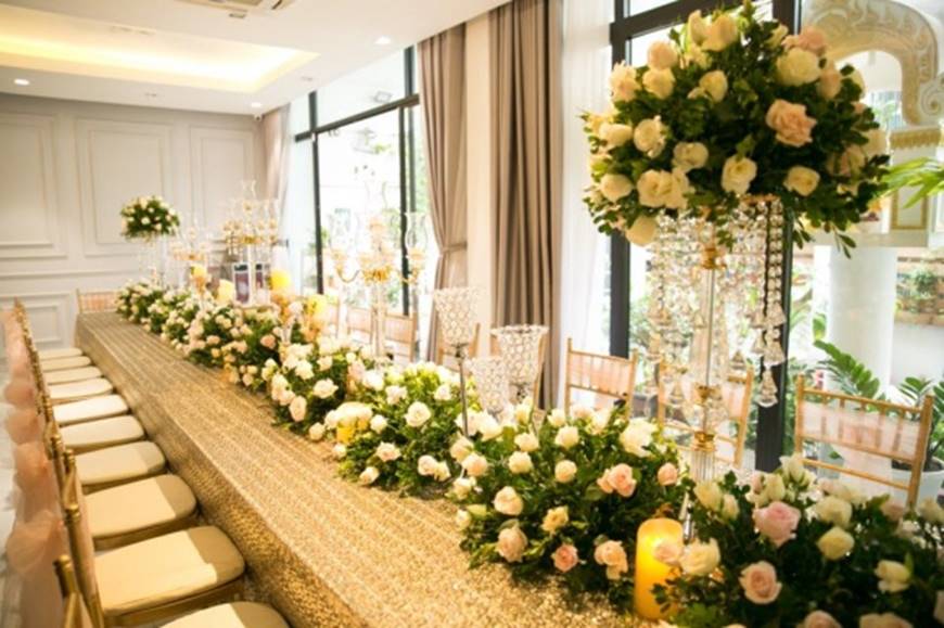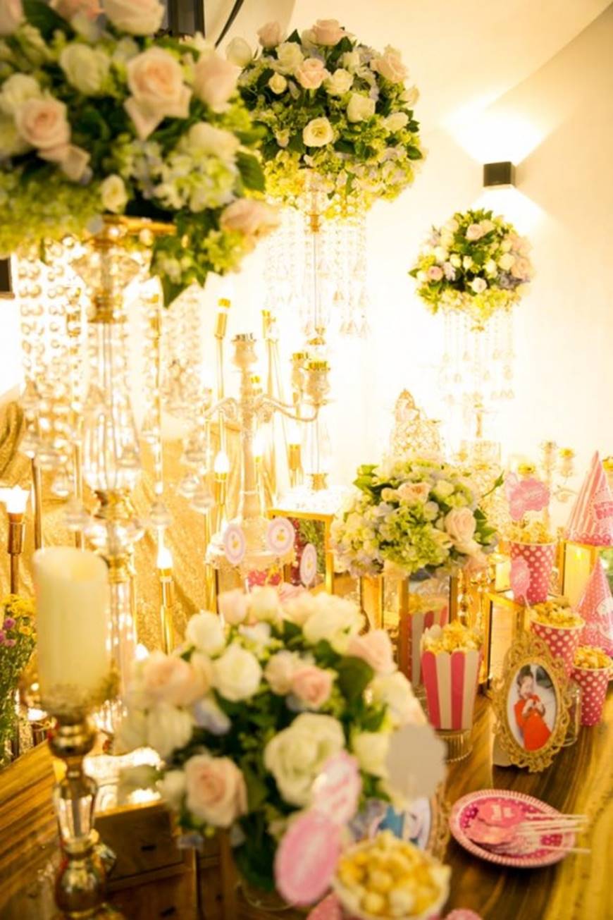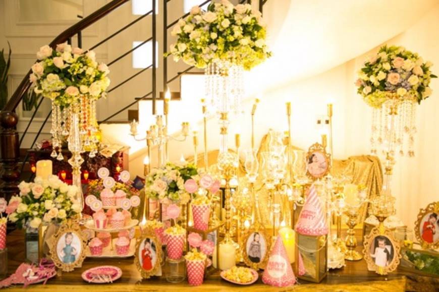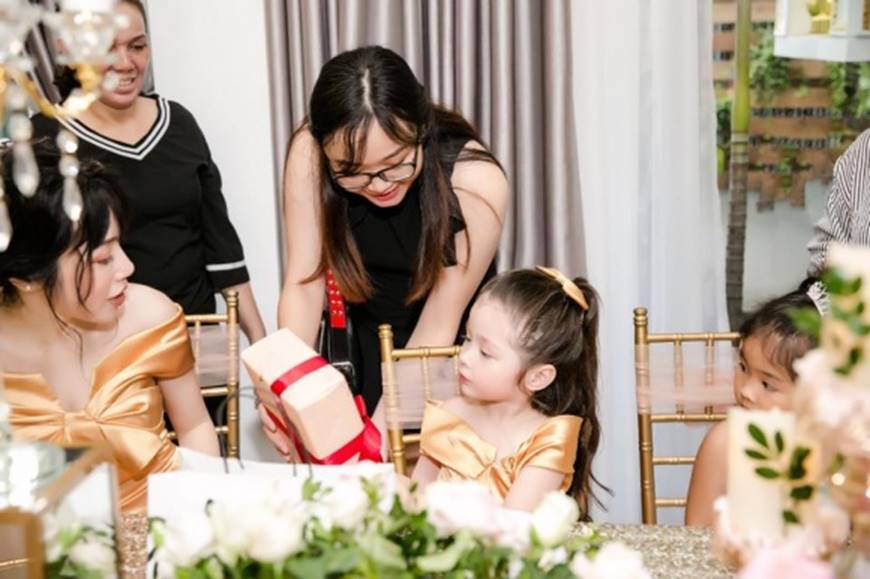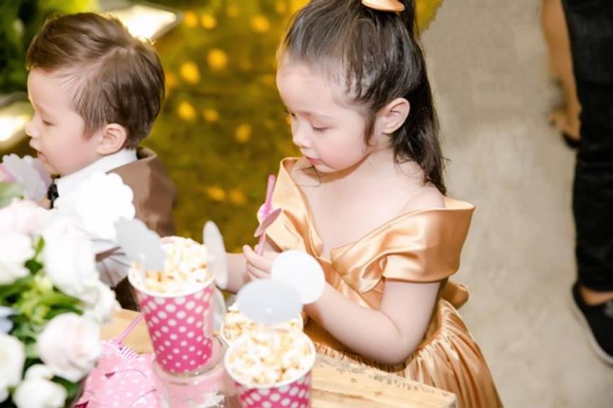 Tiệc sinh nhật của Cadie được Elly Trần tổ chức ở một nhà hàng sang trọng. Năm nay, Elly Trần quyết định chọn tông vàng lấp lánh, ấm áp là chủ đạo trong ngày thêm tuổi mới của con gái.