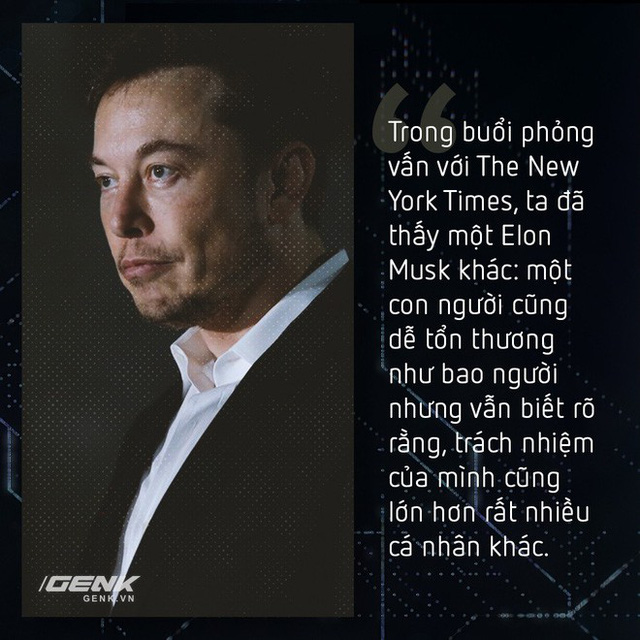 Suốt 20 năm ròng, Musk vẫn luôn là nhà đầu tư can trường và tham vọng, giúp sức mở ra nhiều những công ty công nghệ có sức ảnh hưởng rất lớn. Ông thường xuất hiện trong hiên ngang, gạt bỏ mọi chỉ trích để mà vươn lên đỉnh cao với những thành công khó ai sánh được. Nhưng trong buổi phỏng vấn, ta thấy một con người khác: một cá nhân đang tự nhìn nhận lại bản thân mình, một con người có điểm yếu, xác nhận rằng những trách nhiệm nặng nề mình đang gánh vác đã ảnh hưởng tới bản thân ra sao.