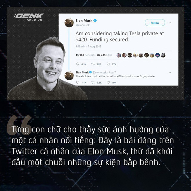 Và cổ phiếu Tesla vút lên với tốc độ của quả tên lửa Falcon Heavy. Các nhà đầu tư, các nhà phân tích thị trường, những cây bút viết báo đăng tin mổ xẻ kĩ càng những lời Elon Musk nói ra. Chẳng mấy khi một tin tức chấn động cả thị trường như thế này lại được tung ra vào lúc giữa trưa cả! Còn chưa kể nó còn đi kèm luôn cả giá cổ phiếu là 420 USD nữa chứ.