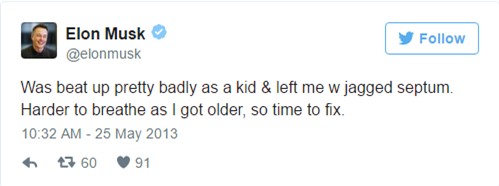 Lớn lên ở Nam Phi, Musk thường xuyên bị bạn học bắt nạt và đánh đập tàn bạo. Ở tuổi 41, anh đã phải trải qua cuộc phẫu thuật để định hình lại vách ngăn mũi – di chứng của những trò bắt nạt tệ hại khi còn đi học.