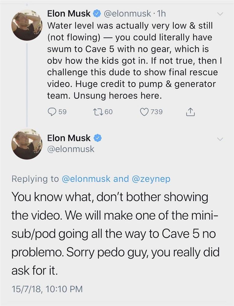 Khi quá trình giải cứu vẫn đang trong giai đoạn lên kế hoạch, có nhiều thông tin khẳng định Elon Musk bị "đuổi khéo", rằng lực lượng giải cứu không cần đến sự trợ giúp của anh cũng như tàu ngầm. Vern Unsworth, một trong những thợ lặn đầu tiên tìm thấy đội bóng bị mắc kẹt thậm chí còn cho rằng tàu ngầm "chỉ là chiêu trò đánh bóng tên tuổi, chắc chắn không thể làm được gì", khiến Elon Musk "nổi cơn tam bành" và buông những lời lẽ thóa mạ ông Vern trên Twitter của mình. Và tất nhiên, những điều này đều khiến giới truyền thông phải chú ý đến anh.