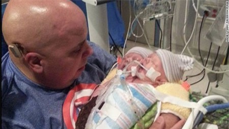 Michael Hamby, bố của cặp song sinh liền thân, bế con tại bệnh viện. Ảnh:CNN |