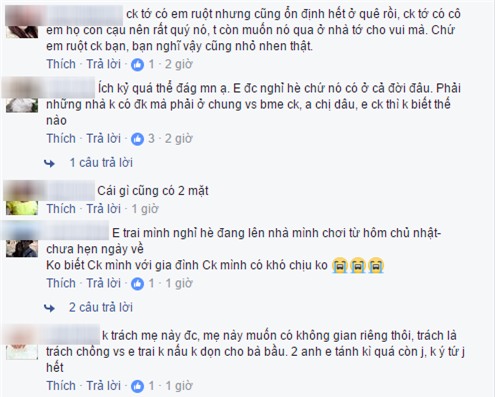 Một số người khác thì tỏ ra phản bác ý kiến của chị gái ở trên khi bình luận rằng: "Các mẹ cứ bao dung độ lượng với suy nghĩ phụ nữ phải chịu khó í nhỉ. Bầu mệt lắm. Đi làm kiếm tiền thì phải chịu vất vả chứ bắt đầu nghỉ thai sản muốn nghỉ ngơi tí trước khi đẻ lại phải hầu thêm một ông tướng ai mà chịu được. Không phải khác máu tanh lòng đâu. Nếu là em ruột mà lên chơi lười chảy thây không giúp gì chị thì cũng ăn chửi. Đấy là em ruột nó sẽ dễ thế còn em chồng thì đâu thể thoải mái mà nói vậy nên chủ top ức chế cũng đúng thôi".