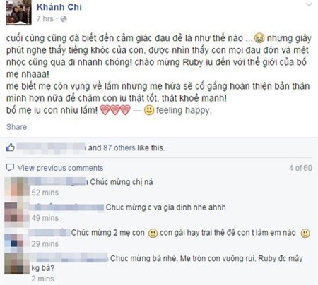 Cô viết: "Cuối cùng cũng đã biết đến cảm giác đau đẻ là như thế nào. Nhưng giây phút nghe thấy tiếng khóc của con, được nhìn thấy con mọi đau đớn và mệt nhọc cũng qua đi nhanh chóng! Chào mừng Ruby iu đến với thế giới của bố mẹ nhaaa!