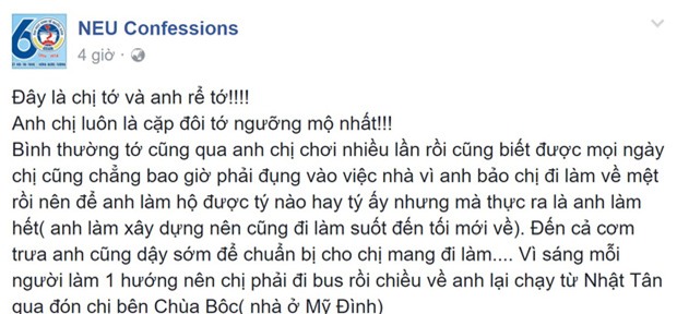 Một bạn trẻ giấu tên mới đây đã đăng tải trên trang NEU Confessions câu chuyện về một cặp vợ chồng trẻ, tuy cuộc sống mới cưới còn nhiều vất vả, nhưng cả hai hết mực yêu thương nhau. Người kể chuyện không ai khác chính là cô em vợ.