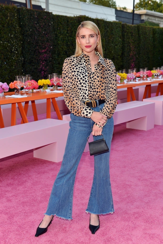 Áo sơ mi họa tiết da báo mang đến cho người diện nét sang trọng. Muốn có được vẻ ngoài trẻ trung khi diện item này, bạn nên học tập Emma Roberts, kết hợp mẫu áo cùng quần jeans ống loe. Công thức này rất nổi bật, toát lên nét cổ điển mà vẫn thời thượng, hút mắt.