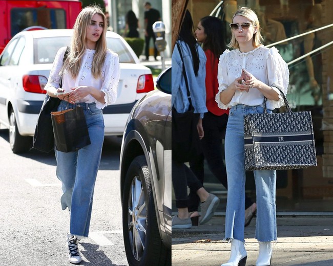 Emma Roberts thường kết hợp áo blouse trắng với quần jeans ống đứng. Đây là công thức ai cũng có thể mặc đẹp. Thiết kế quần jeans ống đứng tạo sự thanh lịch, xen lẫn nét trẻ trung, năng động cho bộ đồ. Combo áo blouse trắng và quần jeans ống đứng không chỉ phù hợp để diện đi dạo phố, mà còn có thể mặc tới công sở.