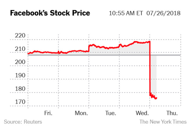 Ngay khi thị trường chứng khoán New York mở cửa sáng 26/7 (đêm 26/7 giờ Việt Nam) giá cổ phiếu của Facebook lập tức giảm 18%. Sự việc diễn ra chỉ một ngày sau thông tin 3 triệu người dùng ở châu Âu từ bỏ Facebook bị phơi lên mặt báo, cùng kết quả kinh doanh không như kỳ vọng của công ty này.