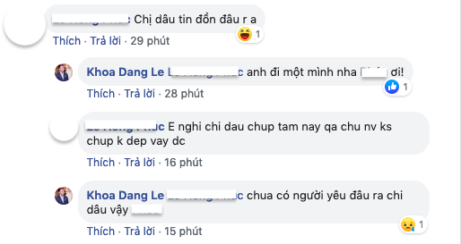 Cụ thể, khi chàng doanh nhân sinh năm 1983 đăng tải hình ảnh nghỉ dưỡng tại Nha Trang, một người bạn của anh đã vui vẻ hỏi: "Chị dâu tin đồn đâu rồi anh?". Đáp lại câu hỏi của người bạn, Shark Khoa thoải mái cho biết: "Anh đi một mình nha".