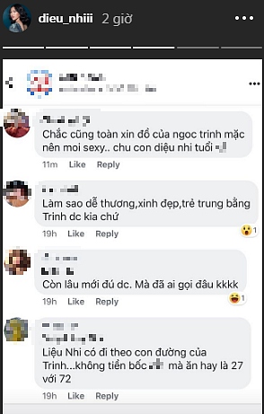 Trên Instagram cá nhân, Diệu Nhi bày tỏ bức xúc với một bộ phận antifan để lại bình luận cho rằng cô dựa hơi, “bám gót” Ngọc Trinh để nổi tiếng. Cụ thể những người này cho rằng nữ diễn viên thường xuyên xin đồ của Ngọc Trinh để mặc, không được sang chảnh như “nữ hoàng nội y” hay những nghi hoặc về việc liệu Diệu Nhi có đi theo con đường thị phi như Ngọc Trinh hay không?. Chính vì vậy Diệu Nhi tỏ ra rất không hài lòng và phải lên tiếng dù từ trước đến nay cô chưa bao giờ gay gắt về bất kì điều gì. Nữ diễn viên đã lên tiếng cảnh báo những người có ý dèm pha và chỉ trích cô vì những lý do không đáng. Diệu Nhi cho biết: “Mọi người nói gì mình, mình biết hết. Chỉ là mình làm biếng gây hấn thôi. Mình sợ gia đình thấy mình gây hấn với xã hội rồi lo cho mình. Chứ mình bị điên, mình không hiền đâu. Các bạn cẩn thận”.