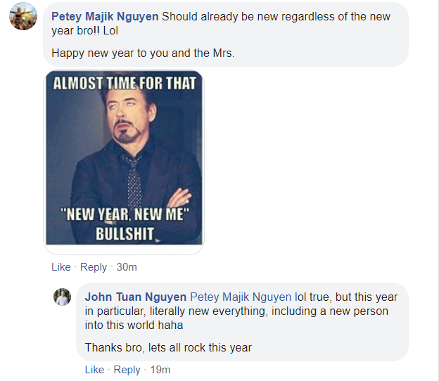 Theo đó, trong một dòng trạng thái mừng năm mới, Tuấn John đã vui mừng chia sẻ tin vui này với một người bạn là ảo thuật gia Petey Majik Nguyễn. Khi Petey nói "Cái gì cũng có thể là mới bất kể có phải năm mới hay không", ông xã Lan Khuê đã phấn khích đáp lời: "True, but this year in particular, literally new everything, including a new person into this world haha" (Tạm dịch: Đúng thế, nhưng năm nay nói riêng, mọi thứ mới theo đúng nghĩa đen. Bao gồm cả việc có một người mới bước vào thế giới này.)