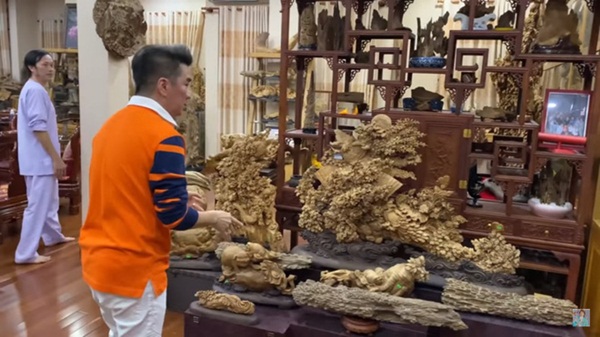 Hoài Linh đáp: "Trầm hết đó em, có cả Kỳ Nam nữa (loại gỗ trầm có giá lên tới vài tỷ đồng). Những cái này người ta điêu khắc, làm hết xong mới gửi cho mình.".