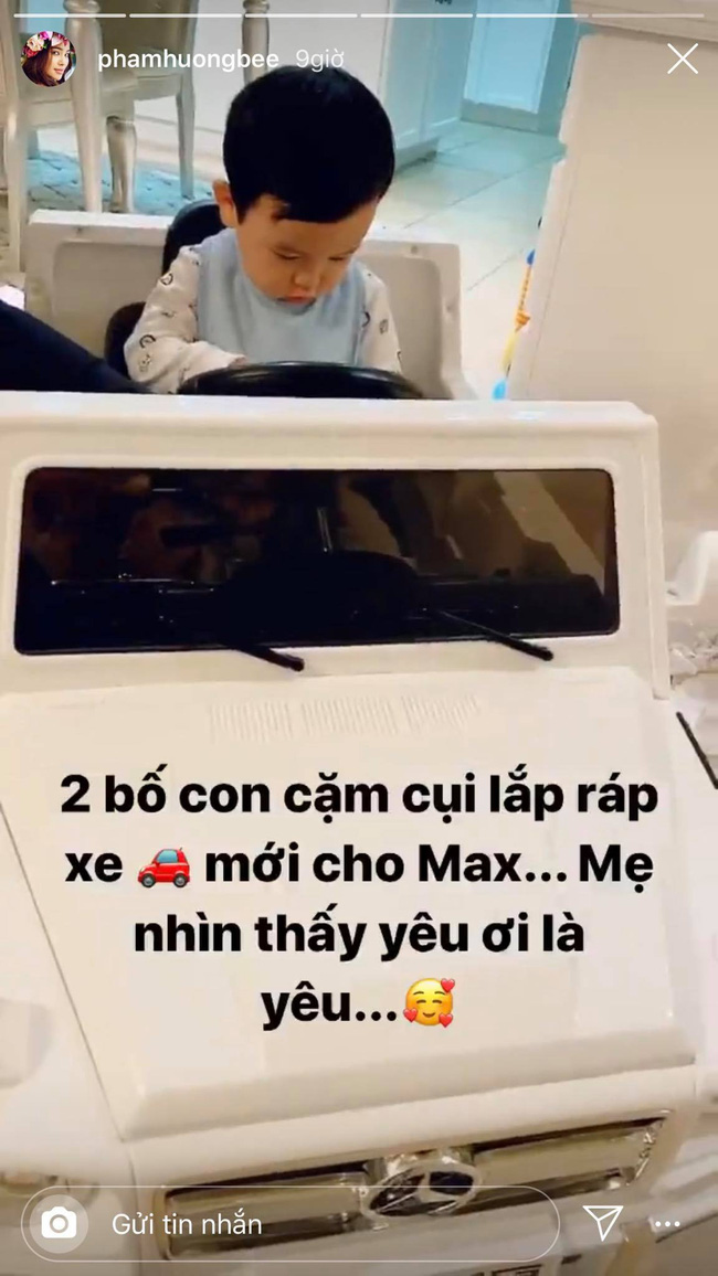 Chia sẻ khoảnh khắc này, Phạm Hương hạnh phúc viết: "Nhìn hai bố con cặm cụi lắp ráp xe mới cho Max. Mẹ nhìn thấy yêu ơi là yêu". Dù vậy, Phạm Hương chỉ quay lướt qua rất nhanh chồng sắp cưới và không để lộ mặt.