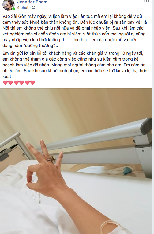 Trên trang cá nhân, Jennifer Phạm chia sẻ: "Vào Sài Gòn mấy ngày, vì lịch làm việc liên tục mà em lại không để ý dù cảm thấy sức khỏe bản thân không ổn. Đến lúc chuẩn bị ra sân bay về Hà Nội thì em không thể chịu nổi nữa và đã phải nhập viện. Sau khi làm các xét nghiệm, bác sĩ chuẩn đoán em bị viêm ruột thừa cấp mọi người ạ. Cũng may nhập viện kịp thời không thì... Em đã được mổ và hiện đang nằm "dưỡng thương"."