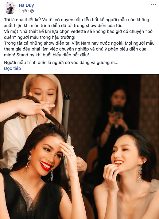 Trước nhiều thông tin trái chiều, chúng tôi đã liên hệ với phía Hương Giang để tìm hiểu rõ thực hư. Theo đó, đại diện truyền thông của Hương Giang cho biết: "Về lịch trình làm việc ở show diễn của NTK Hà Duy, Hương Giang đã có báo trước với chính NTK về việc mình bận lịch làm việc tại Tp. HCM nên không thể có mặt ở Hà Nội tập luyện vào ngày 29/6, và ngày 30/6 cô sẽ tự trang điểm trước khi qua show diễn. NTK Hà Duy đã đồng ý và còn gửi layout make up cho Hương Giang.
