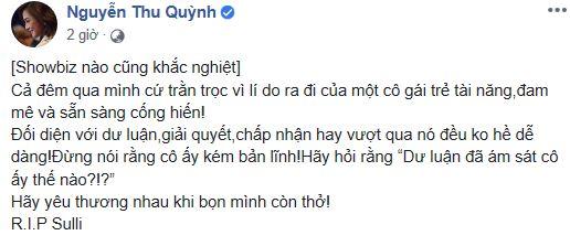Mới đây, diễn viên Thu Quỳnh nhắn nhủ sâu sắc sau sự ra đi của Sulli: “Showbiz nào cũng khắc nghiệt. Cả đêm qua mình cứ trằn trọc vì lí do ra đi của một cô gái trẻ tài năng,đam mê và sẵn sàng cống hiến!