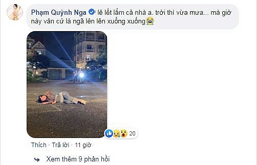 Quỳnh Nga vừa đăng ảnh với gương mặt bị xây xước và chia sẻ: “tưởng hết tháng cô hồn rồi chứ“. Hình ảnh này khiến nhiều người lo lắng cho Quỳnh Nga. Tuy nhiên, hình ảnh chỉ là một cảnh trong phim. Nữ diễn viên tiết lộ thêm cảnh nằm trên đường: “lê lết lắm cả nhà ạ. Trời thì vừa mưa… mà giờ này vẫn cứ là ngã lên lên xuống xuống”.
