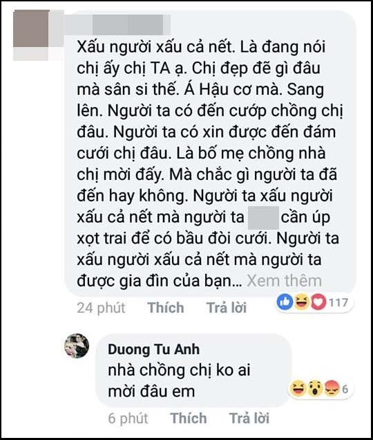 Vướng nghi án đá xéo Văn Mai Hương, Tú Anh bị một dân mạng dằn mặt: "Chị đẹp đẽ gì đâu mà sân si thế. Á hậu cơ mà, sang lên. Người ta có đến cướp chồng chị đâu. Người ta có xin được đến đám cưới chị đâu. Là bố mẹ chồng nhà chị mời đấy. Mà chắc gì người ta đã đến...".