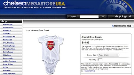 CĐV Chelsea đã shock nặng khi thấy trang web bán hàng trực tuyến của CLB ở Mỹ thông báo bán đồ sơ sinh có gắn logo Arsenal. Theo đó, những chiếc quần liền áo của trẻ sơ sinh có gắn logo Arsenal được chào bán 16,99 USD.